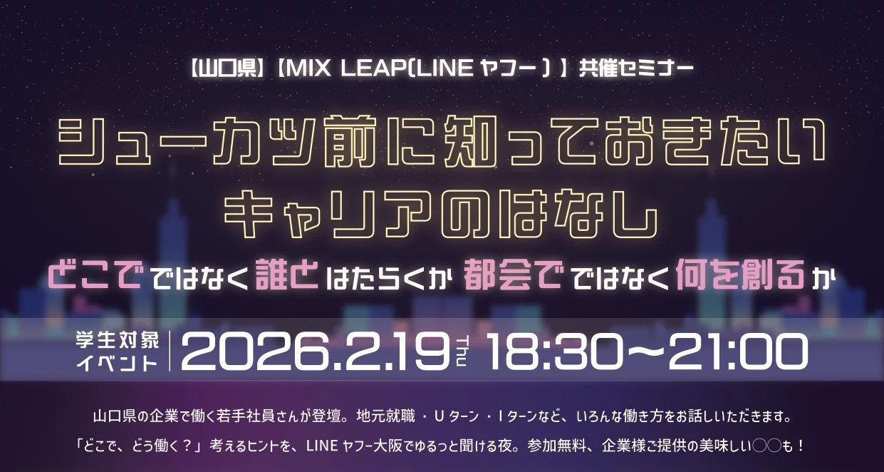 2月19日(木)に行われる「【山口県×MIX LEAP(LINEヤフー)共催セミナー in 大阪】シューカツ前に知っておきたいキャリアのはなし!」に出展します。